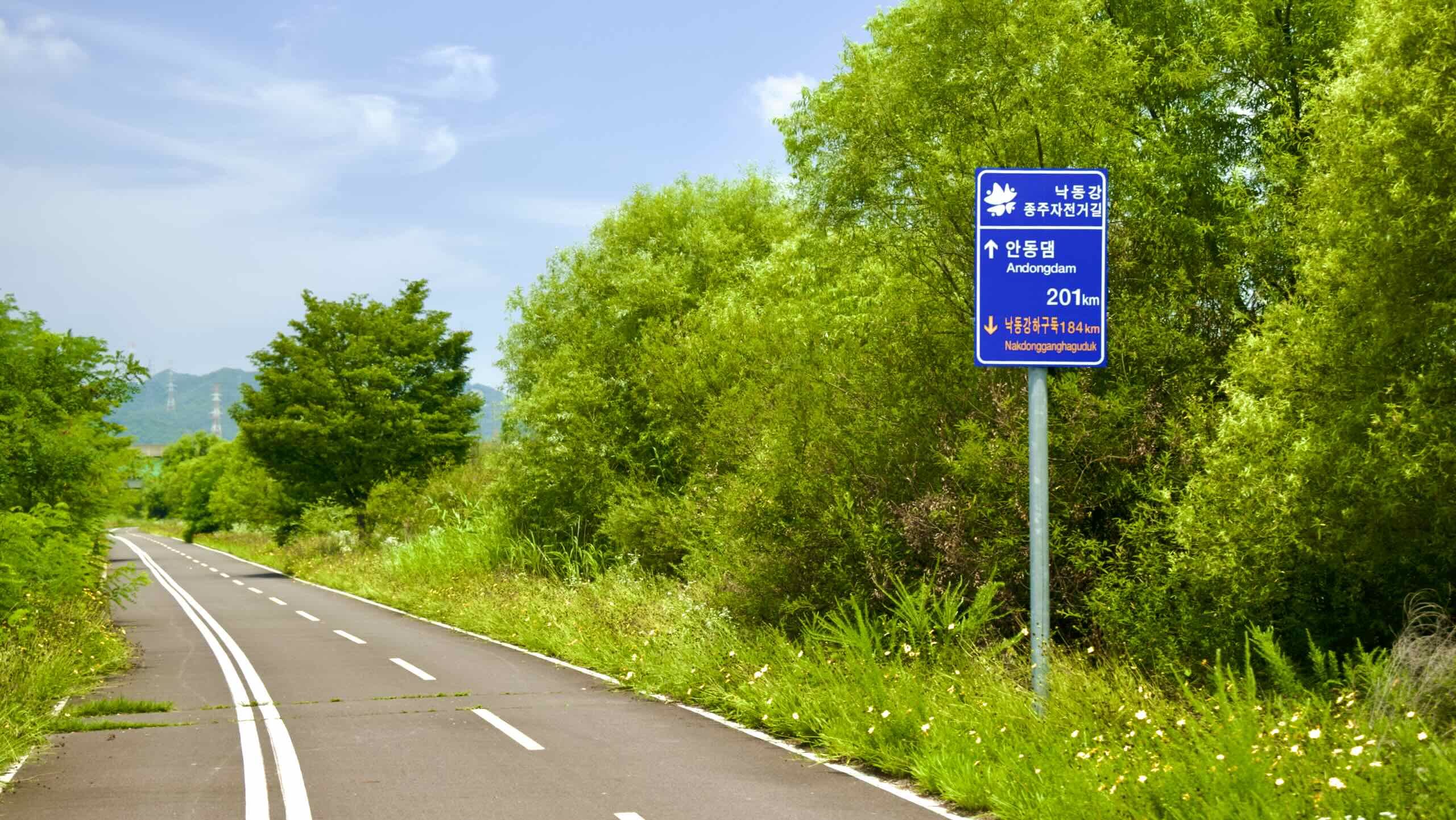 강을 따라 자전거 도로에 다시 합류할 때까지 현풍의 거리와 보도를 탐색하세요(지도). 5km도 채 지나지 않아 (도로보기), 시골길은 자전거 도로를 방해합니다.