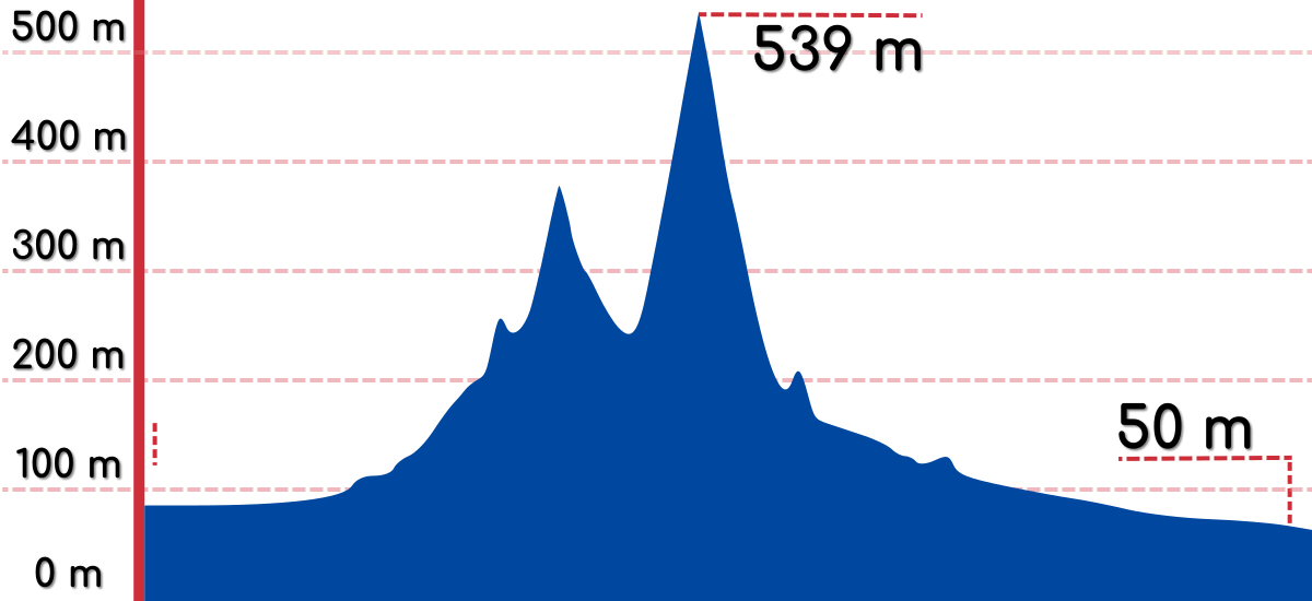 • 총 고도(남에서 북으로): 평균 경사도 2.4%로 6.2km를 넘는 151m 고도.