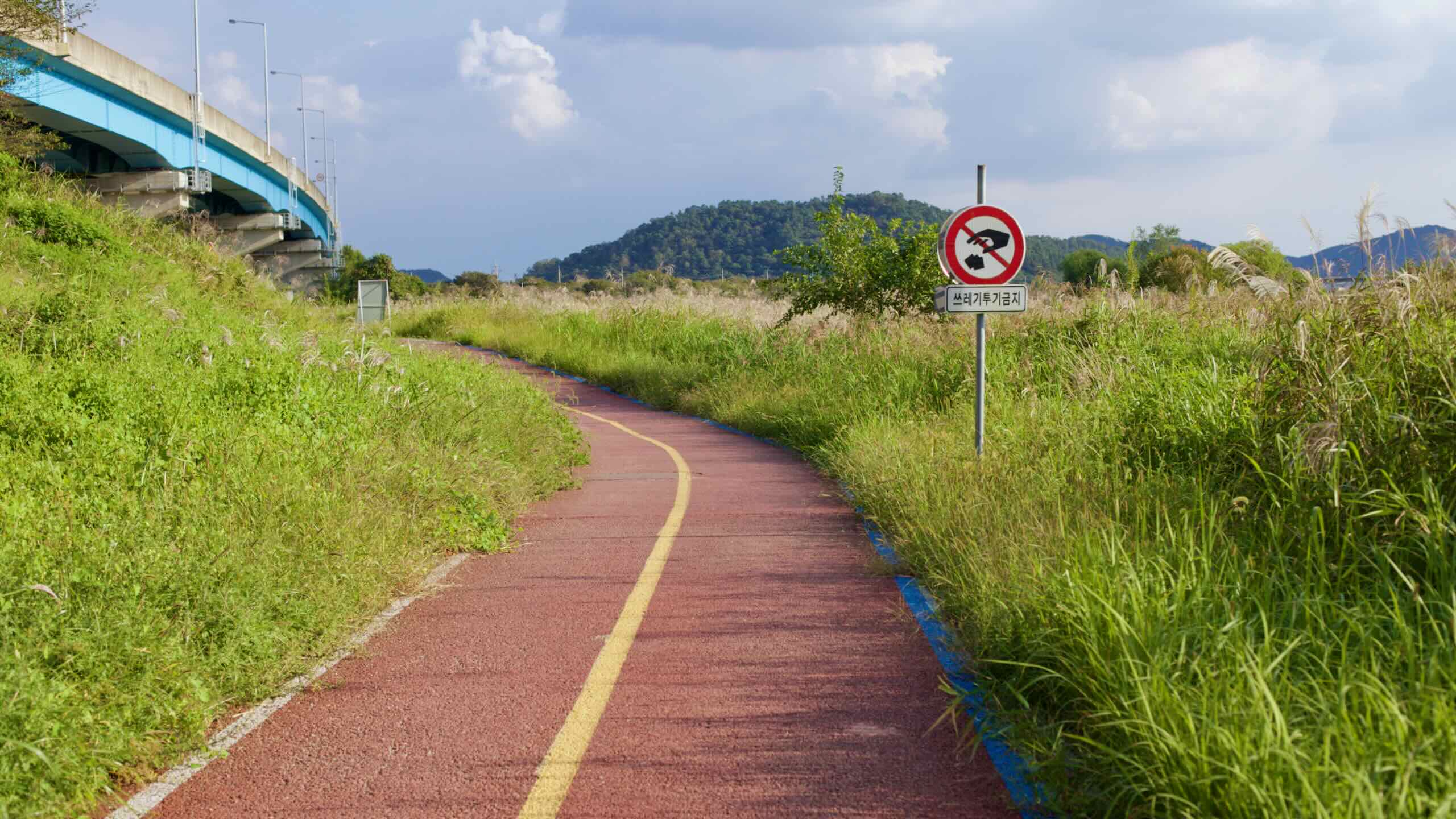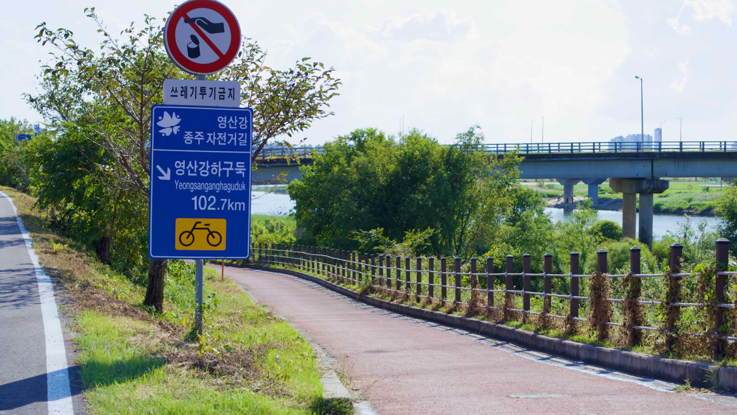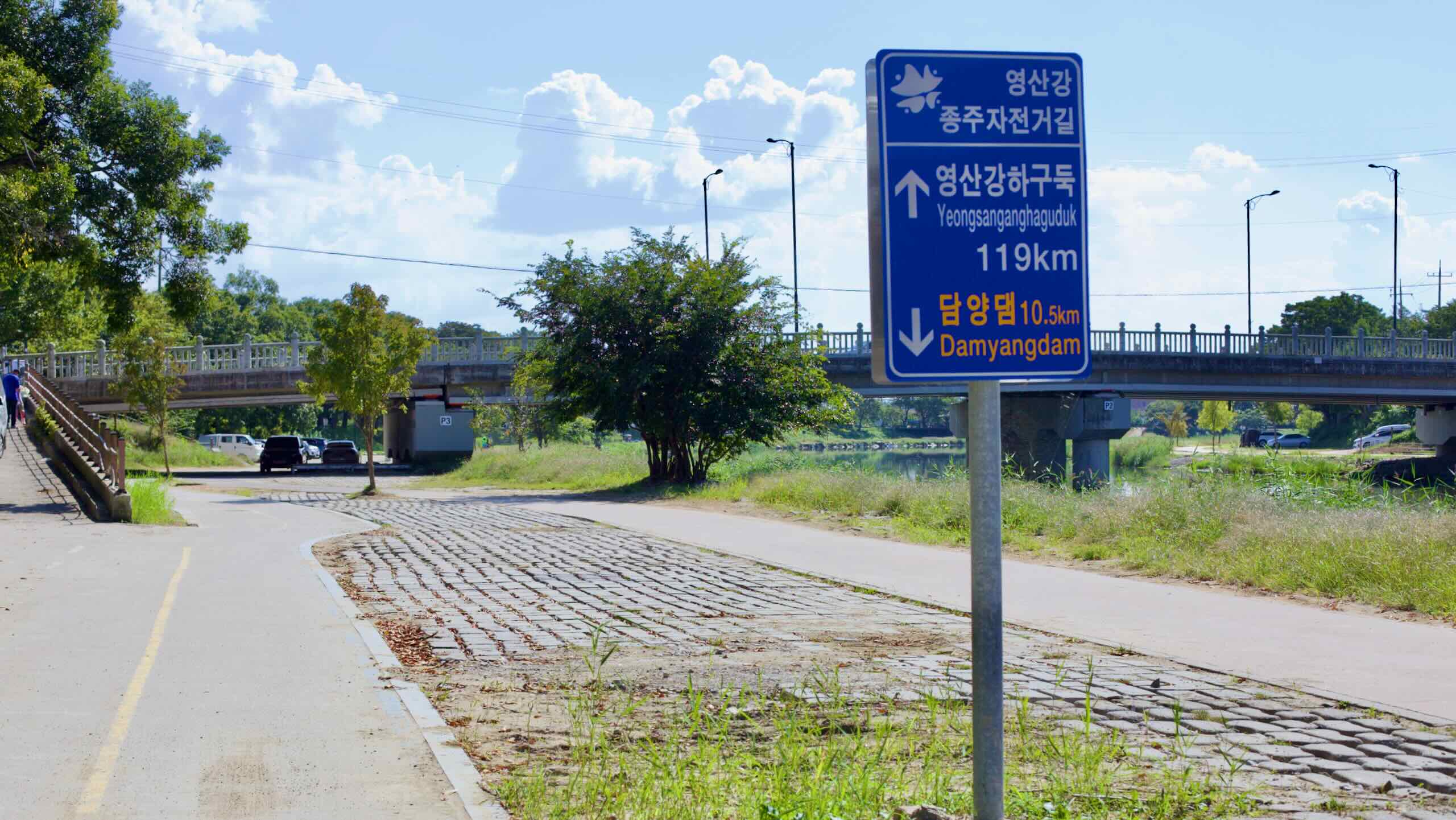 담양 대나무숲 인증센터]에서 출발해 영산강 옆 긴 아치형 길을 따라 계속 가세요. 광주의 안쪽 지역에 가까워질수록 높은 아파트 건물이 스카이라인을 채웁니다.