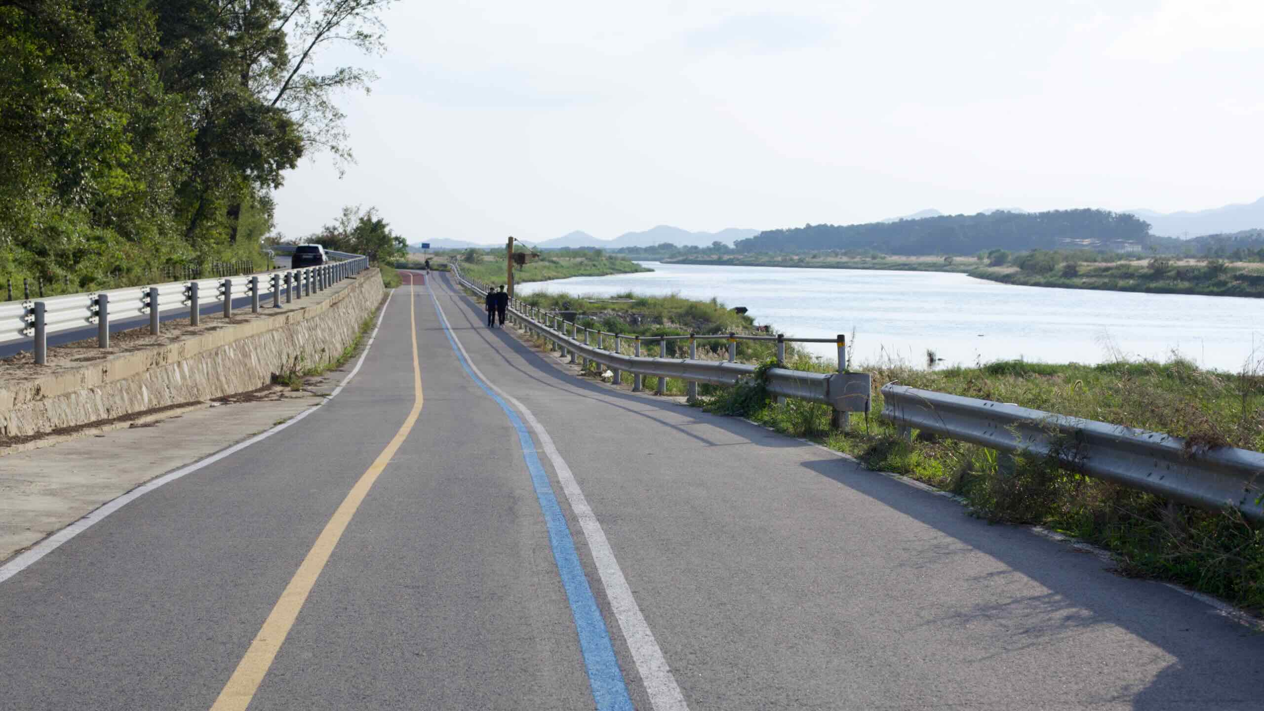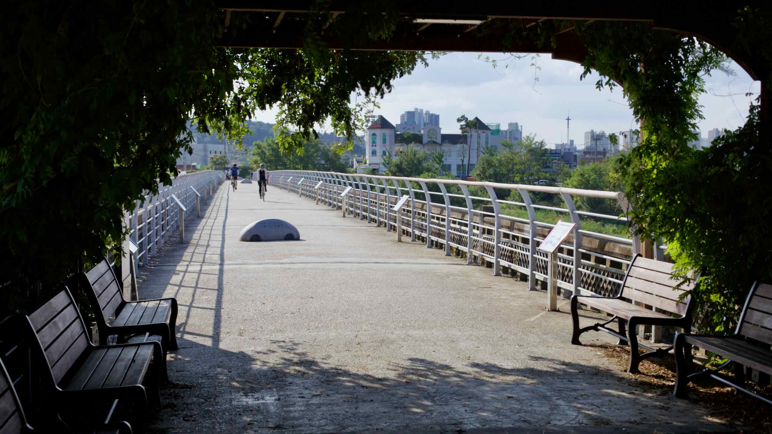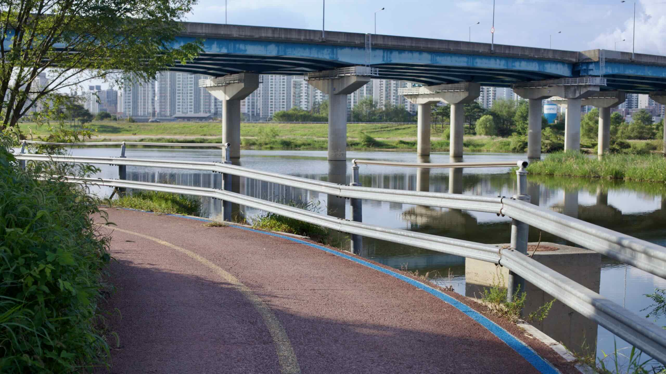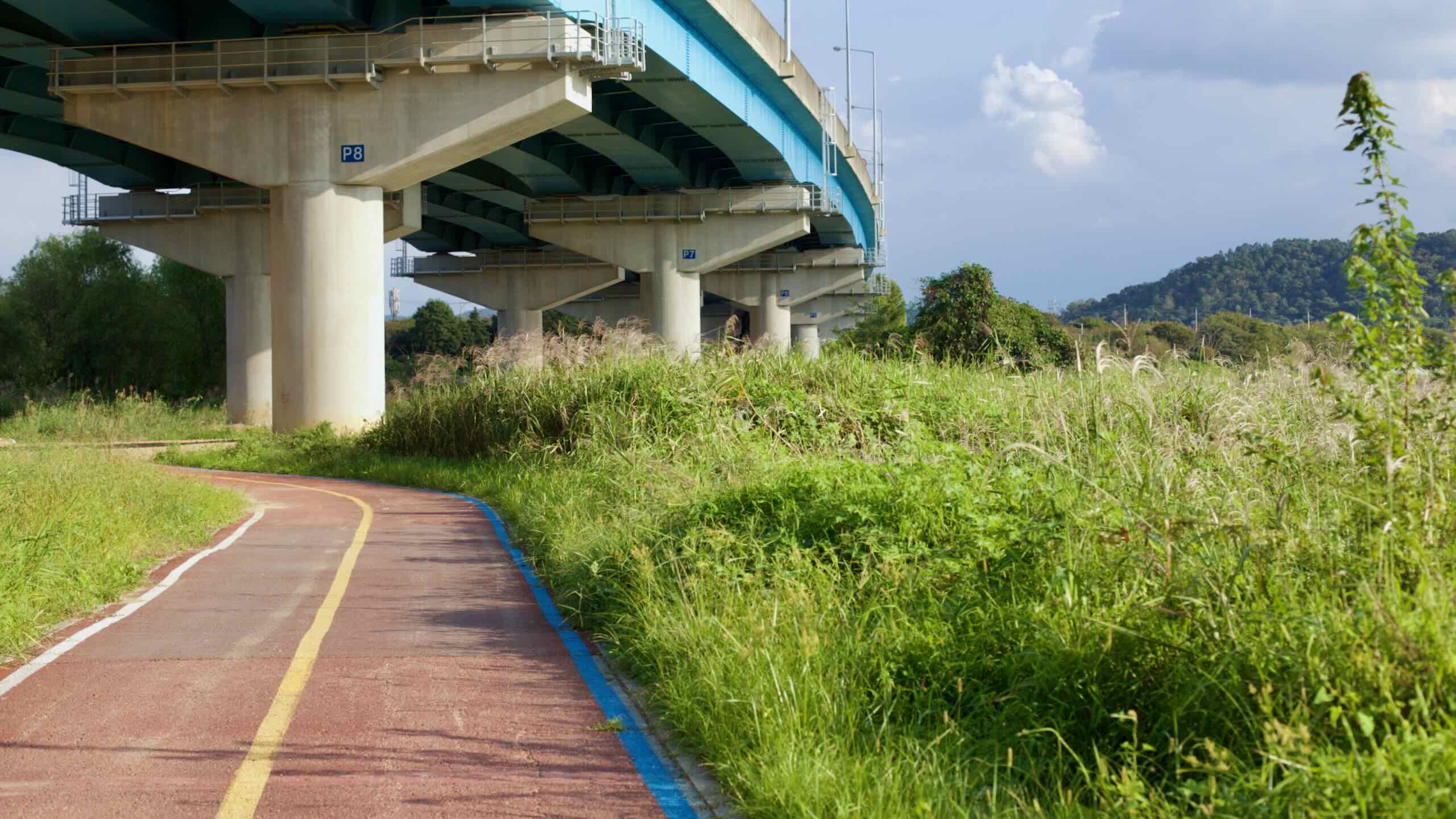 담양 대나무숲 인증센터]에서 출발해 영산강 옆 긴 아치형 길을 따라 계속 가세요. 광주의 안쪽 지역에 가까워질수록 높은 아파트 건물이 스카이라인을 채웁니다.
