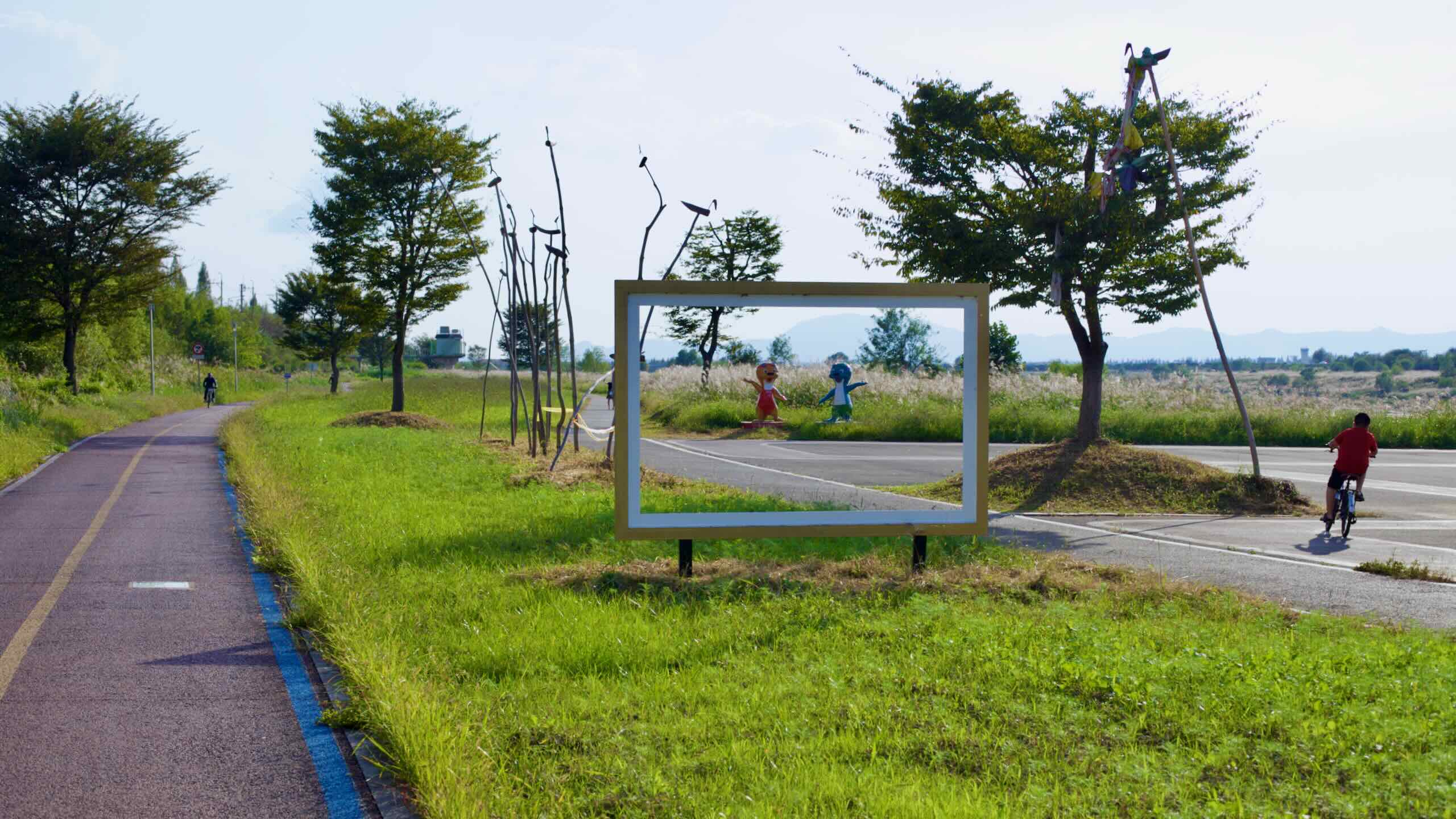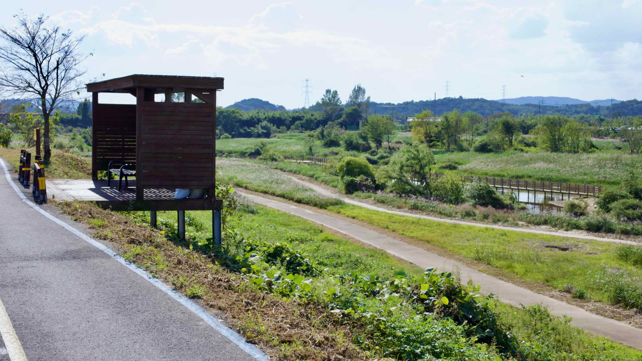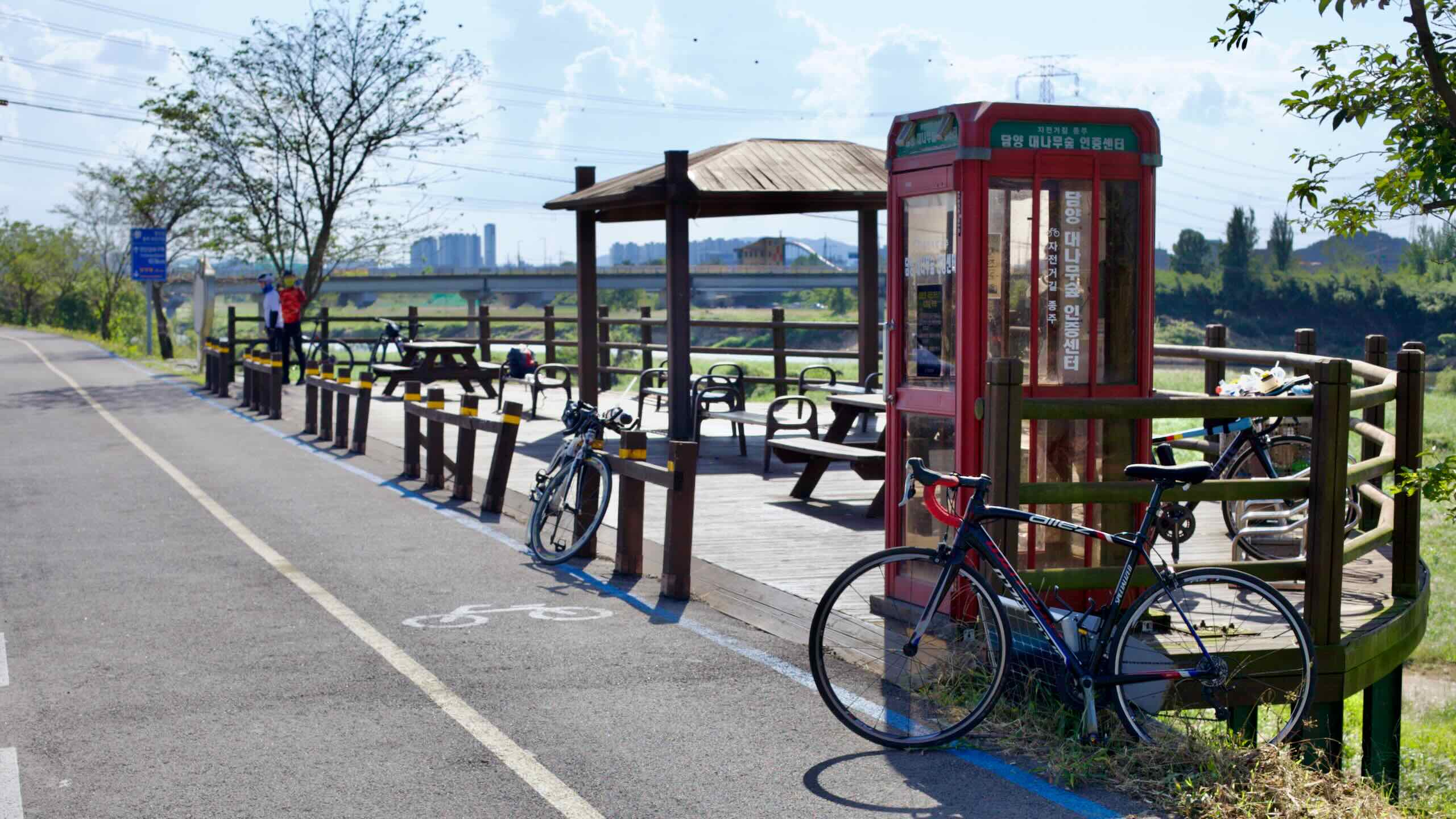 용산습지공원 안쪽에는 몇 개의 전망 데크가 영산강 위로 돌출되어 있으며, 그 중 하나에 빨간 스탬프 부스인 담양 대나무숲 인증센터 (지도; 로드뷰)가 있습니다. 자전거에서 내려 자전거여권을 꺼내 영산강 자전거길의 세 번째 스탬프를 찍으세요.