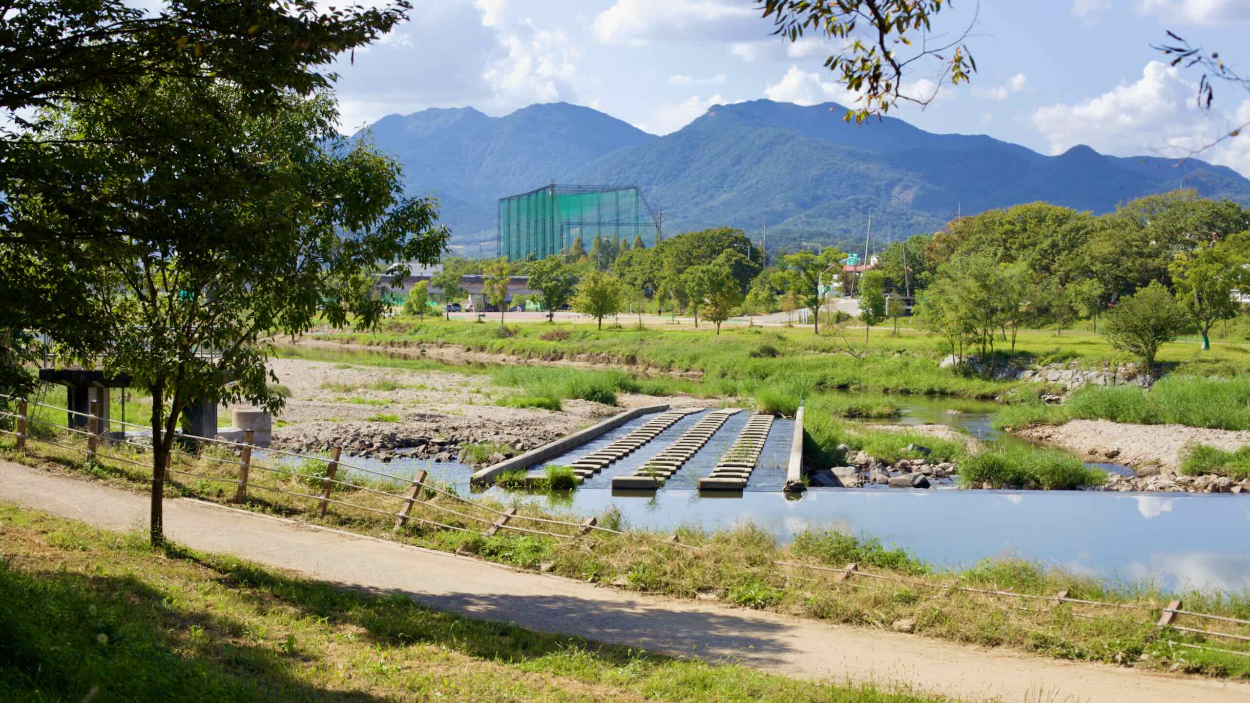 - 산동교친수공원 (지도) — 산동교 인근 동쪽 강둑의 넓은 수변 공간으로, 4.6 km 길이의 자전거 트랙이 주 경로와 평행하게 나 있으며 유채꽃과 코스모스 꽃밭, 운동 기구, 게이트볼 코트가 있습니다. 캠핑이나 취사는 허용되지 않습니다.