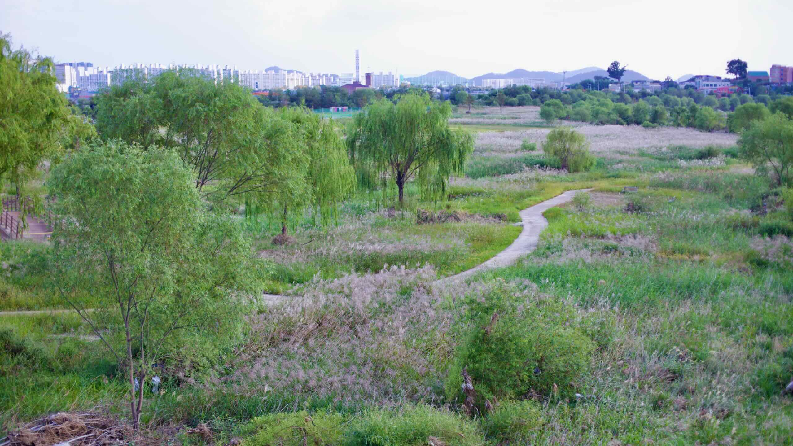 이 구간의 끝자락에 용산지구 생태습지공원 (지도)에 들어서게 됩니다. 이곳은 2004년에 지정된 총면적 98만 1천㎡의 담양강 습지의 일부로, 맑은 강변 녹지로 보호되고 있습니다.