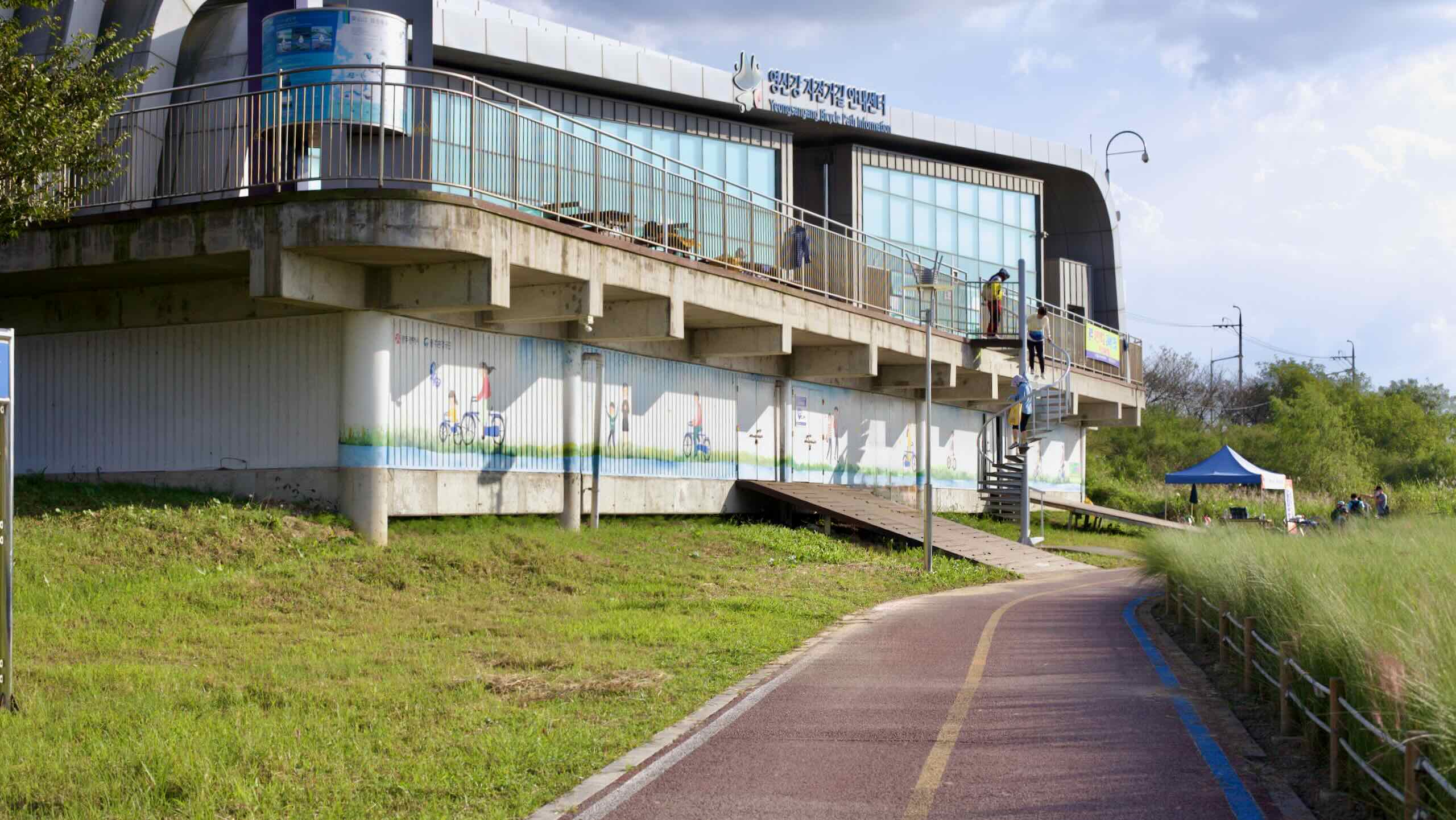 공원에서 가장 큰 건물은 영산강문화관 (지도)입니다. 이곳에는 영산강의 역사·생태·복원 프로젝트를 다루는 K-water의 강 박물관(입장 무료; 9:00–16:00, 여름에는 –18:00; 월요일 휴관)이 있으며, 상설·기획 전시실, 카페, 그리고 자전거여권을 구매하고 스탬프를 찍을 수 있는 안내 데스크가 있습니다.