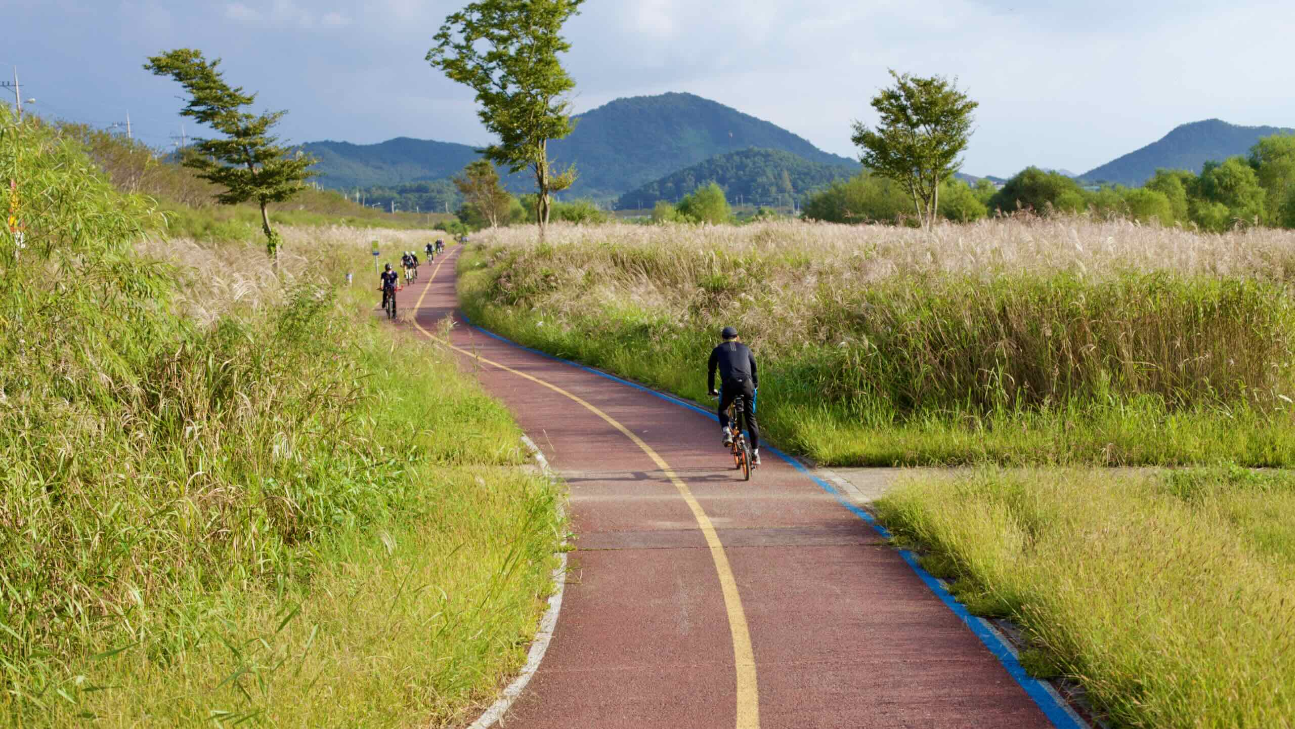 대나무 미로를 벗어나 담양 도심을 가로질러 고목 숲과 국수 거리를 지나 보세요. 이후 시골로 빠져나와 광주시 경계까지 향하는 자전거 여행이 이어집니다.