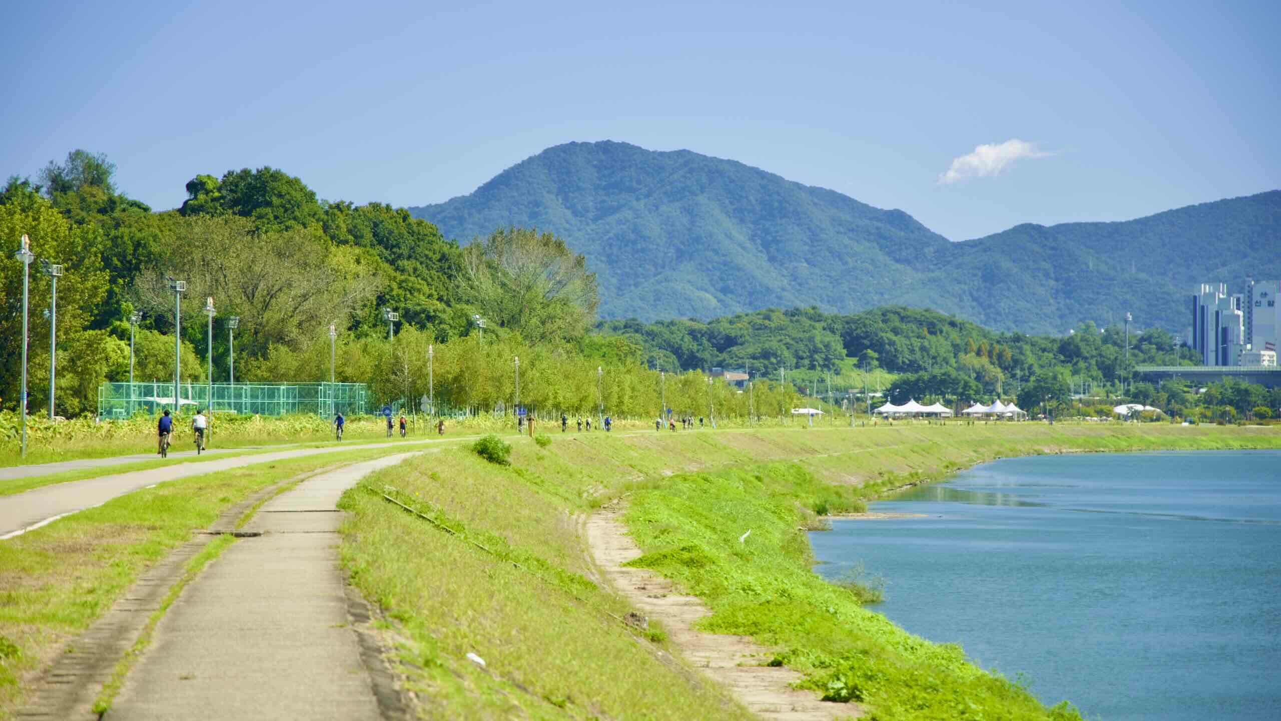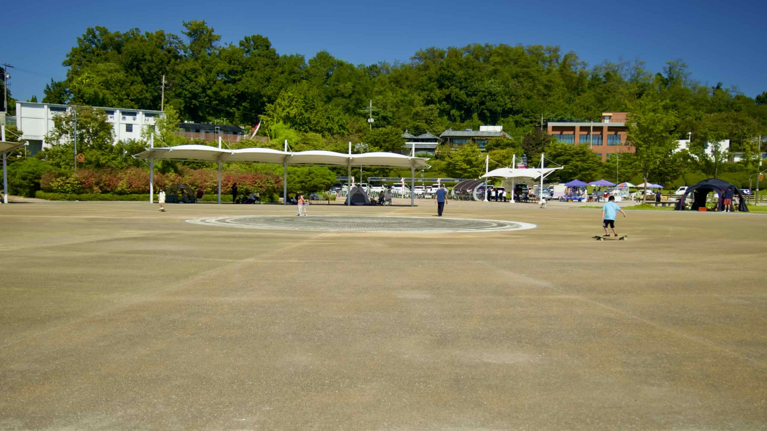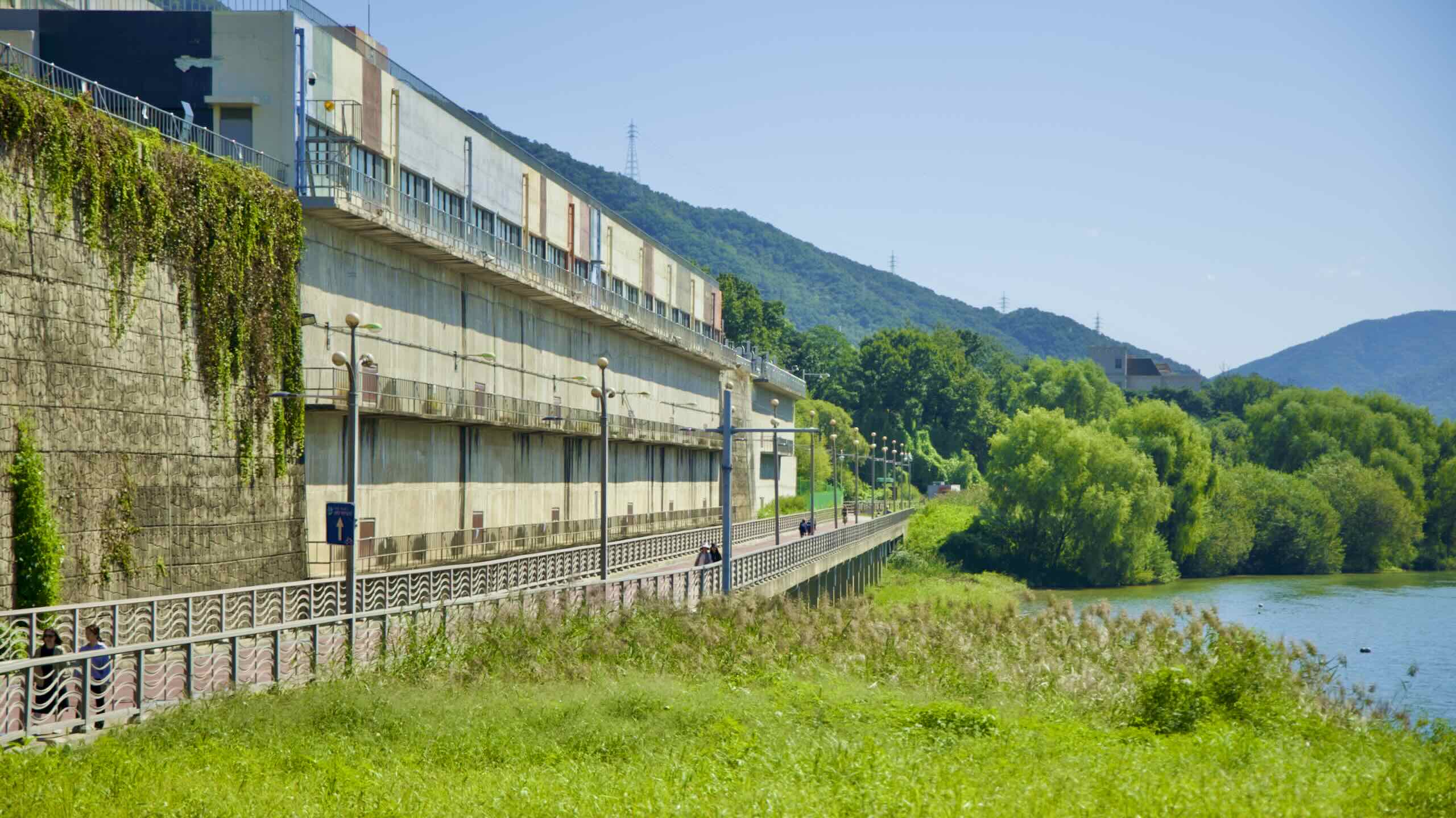 구리시 (구리시; 지도) 그리고남양주시 (남양주시; 지도) 서울 바로 동쪽의 한강에 나란히 앉아 있습니다. 위성 도시를 통과하는 자전거 도로는 수변 공원을 가로지릅니다.산길, 그리고소각장에 묶인 전망대.
