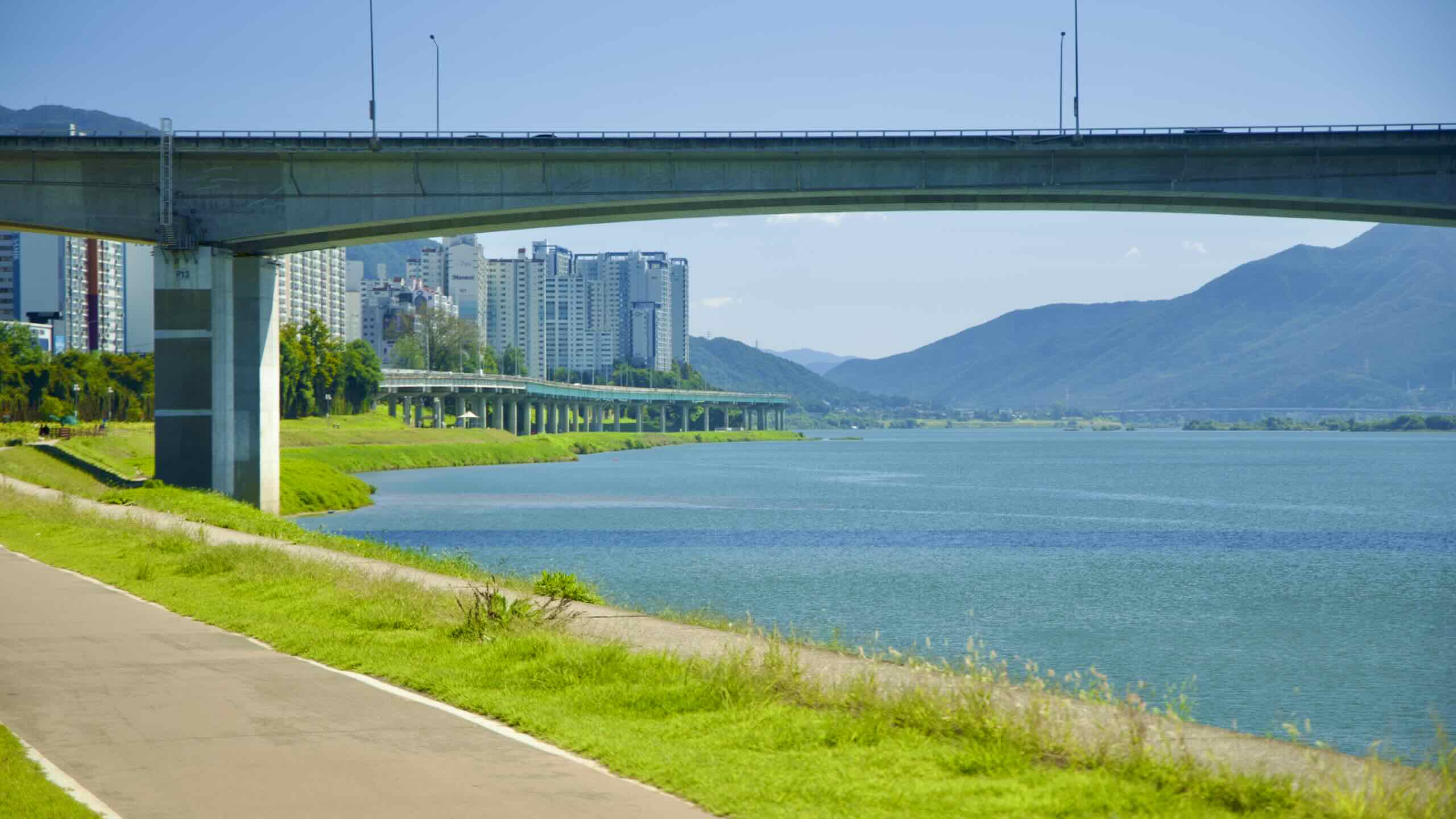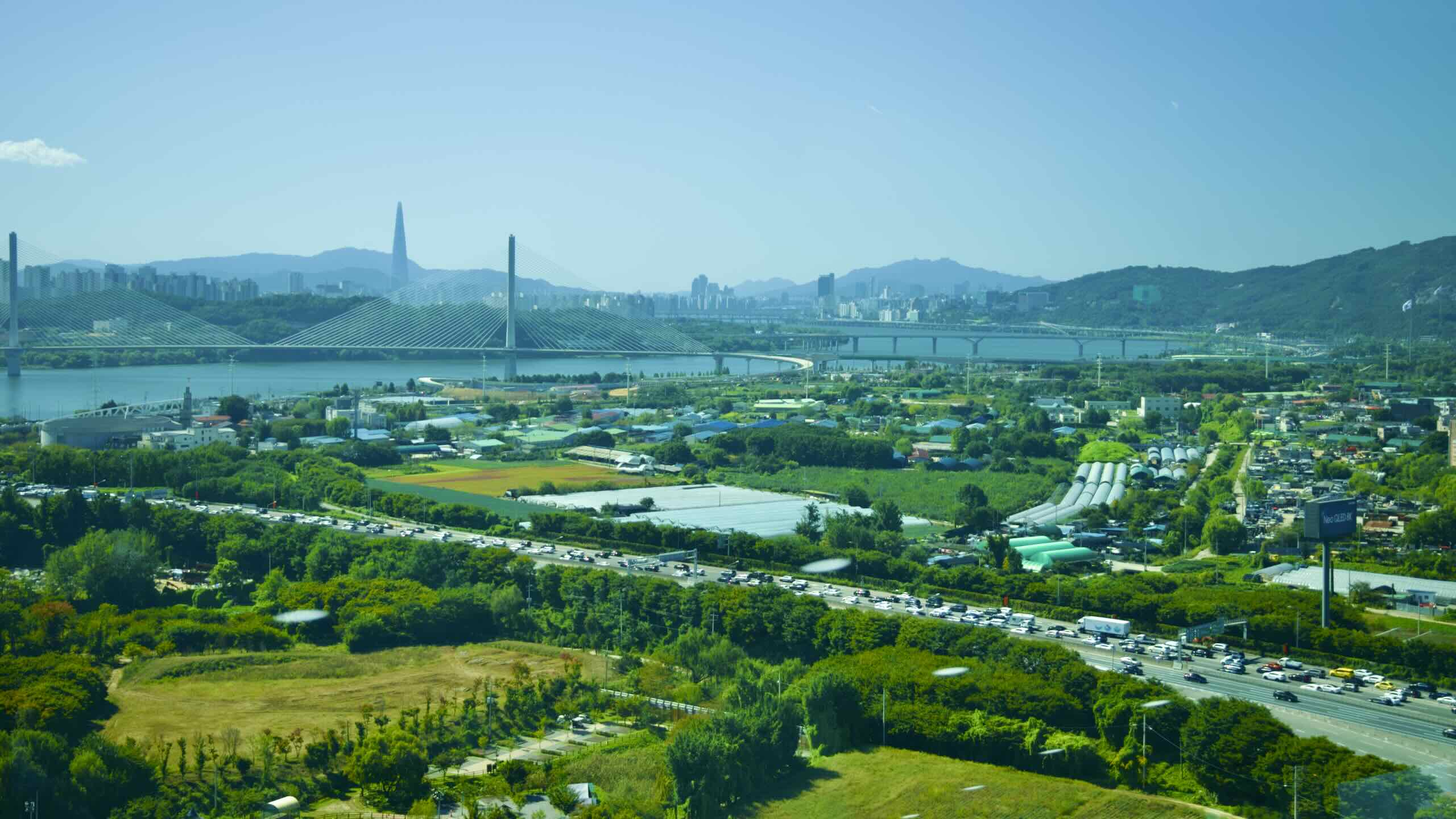 경강로, 이는동안‘에스강릉시, 붐비는 삼패지구 외곽을 스치고 한강 가장자리 위로 떠다닙니다.
