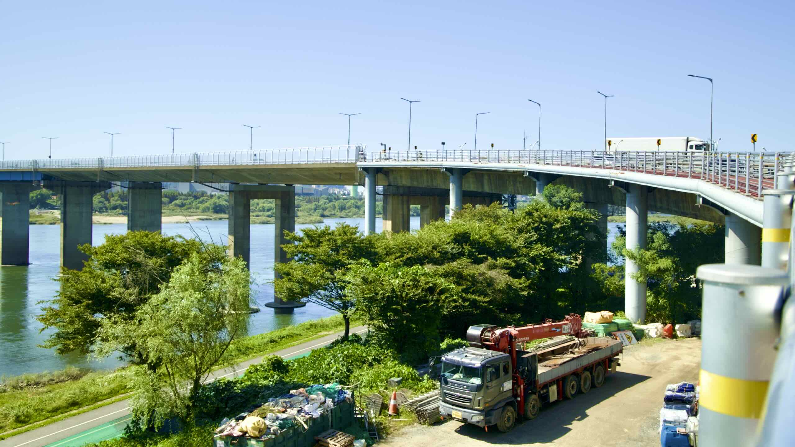 바로 앞에 한강 위로 케이블을 부채질하는 콘크리트 타워가 있습니다. 그들은 지원한다고덕대교 (고덕대교; 지도). 2024년 완공되면 지지 경간 길이가 540m로 세계에서 가장 긴 사장교가 되었습니다. 다리는 6개의 차선을 가지고 있습니다.세종포천고속도로, 서울을 연결하다강동지구 ~와 함께구리시 북쪽에.
