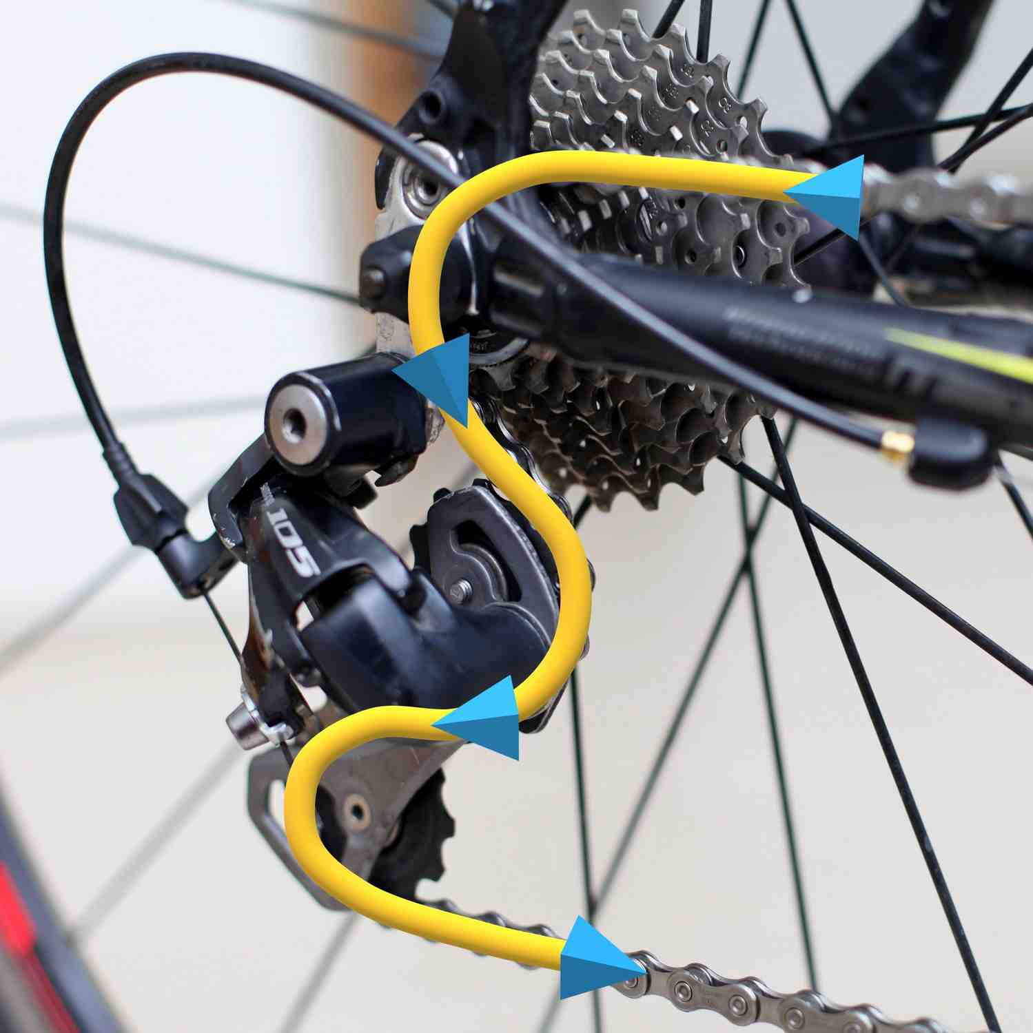 - 체인의 장력을 줄이기 위해, 앞드레일러를 가장 작은 체인 링으로, 뒷드레일러를 카세트의 중간 톱니바퀴로 옮기세요.