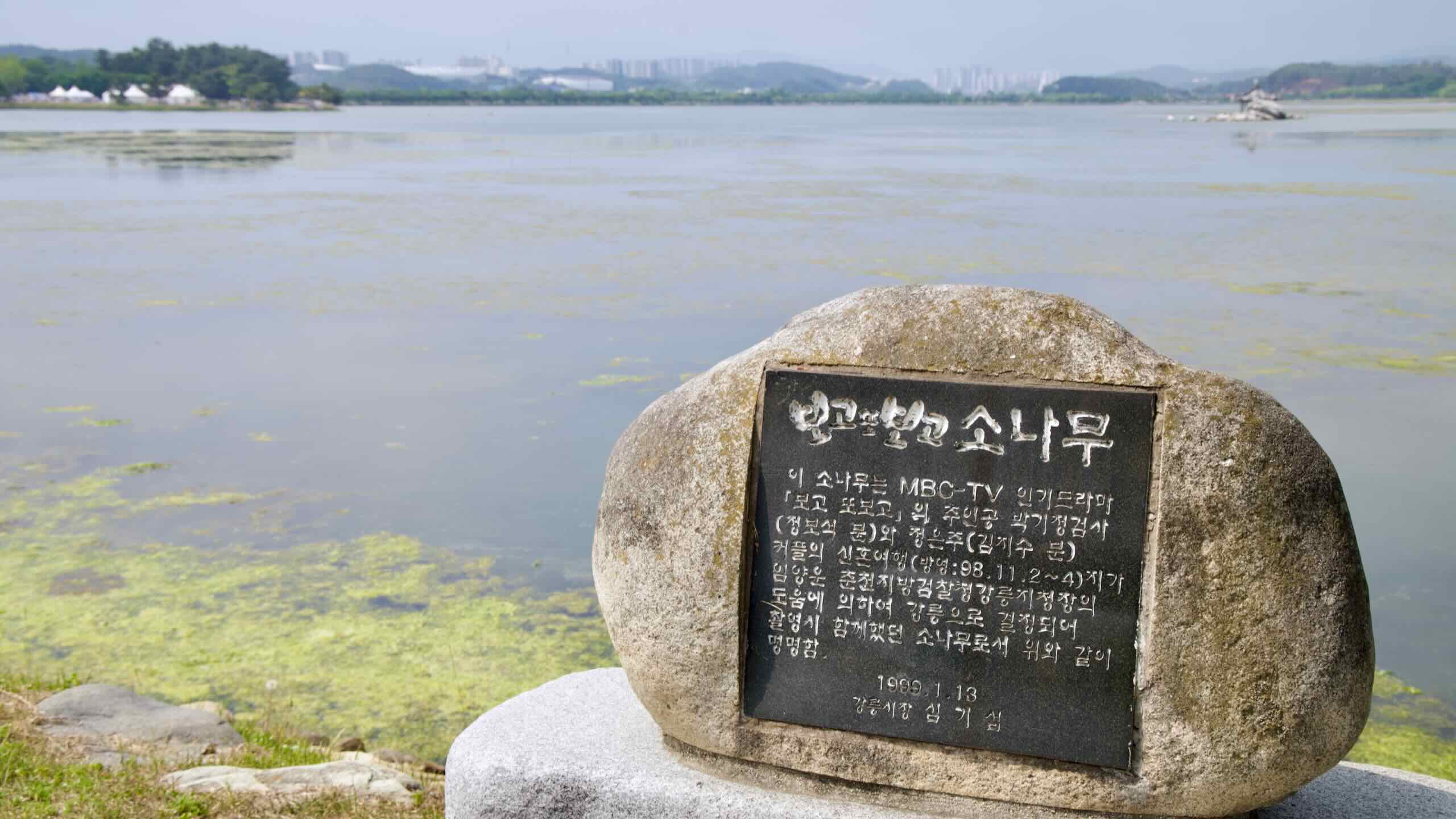Gyeongpo Lake (경포호; map), often refered to as “Mirror Lake,” is a natural lagoon separated from the East Sea by a thin stretch of coastal sand dune on Gangneung City’s coast. Locals regard the lake for its waters that reflect the sky and moon, and a primeval pine forest that encircles its waterside.