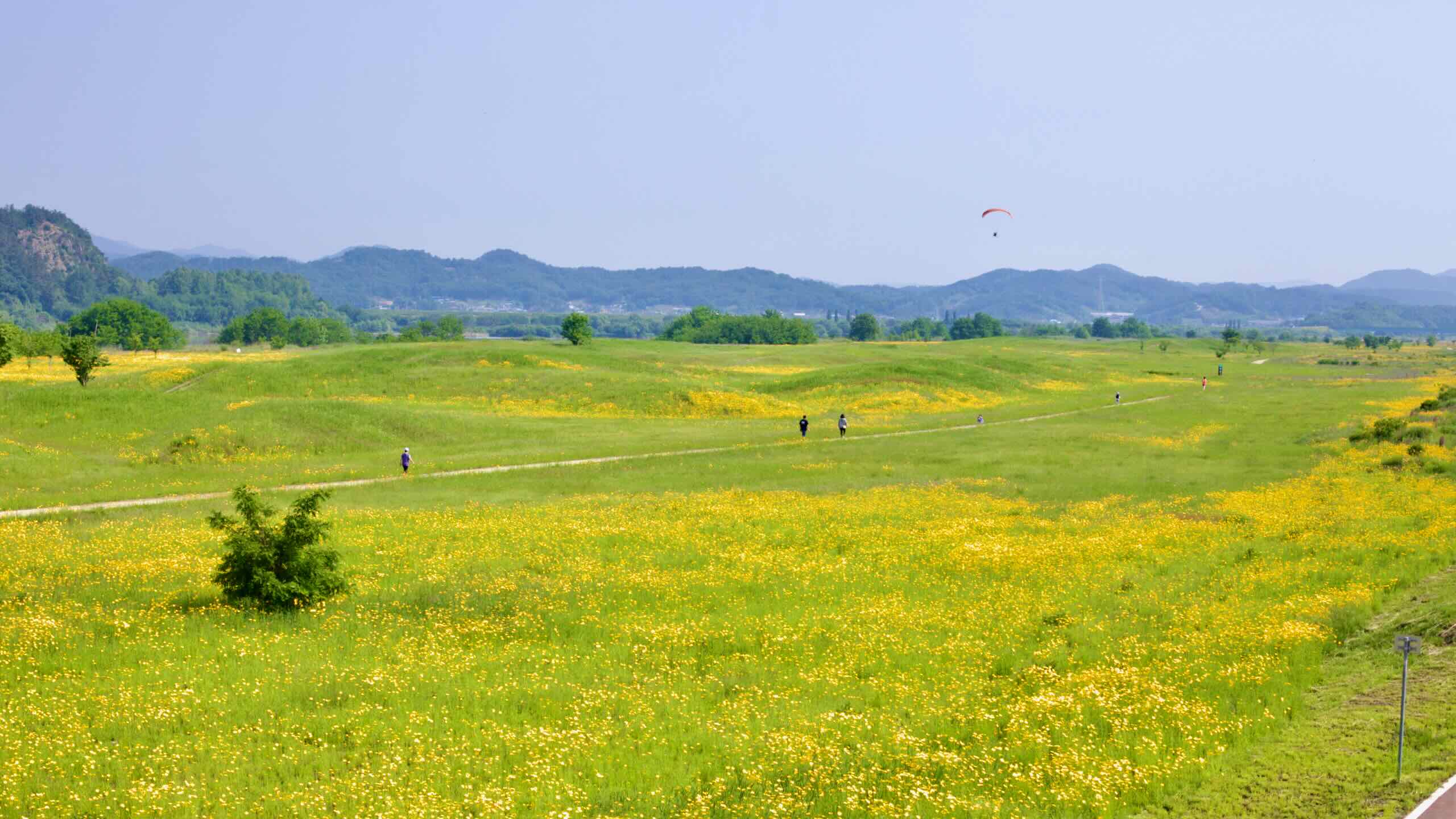 Exit south from Baekje Bridge into Narae Park (나래공원; map), home to sweeping fields of silver reeds and pink cosmos in autumn. Follow the river for seven kilometers through more flower-filled fields until a pair of low peaks—Yongmeori (용머리산; map) and Pajin (파진산; map)—push the bike path closer to the water.