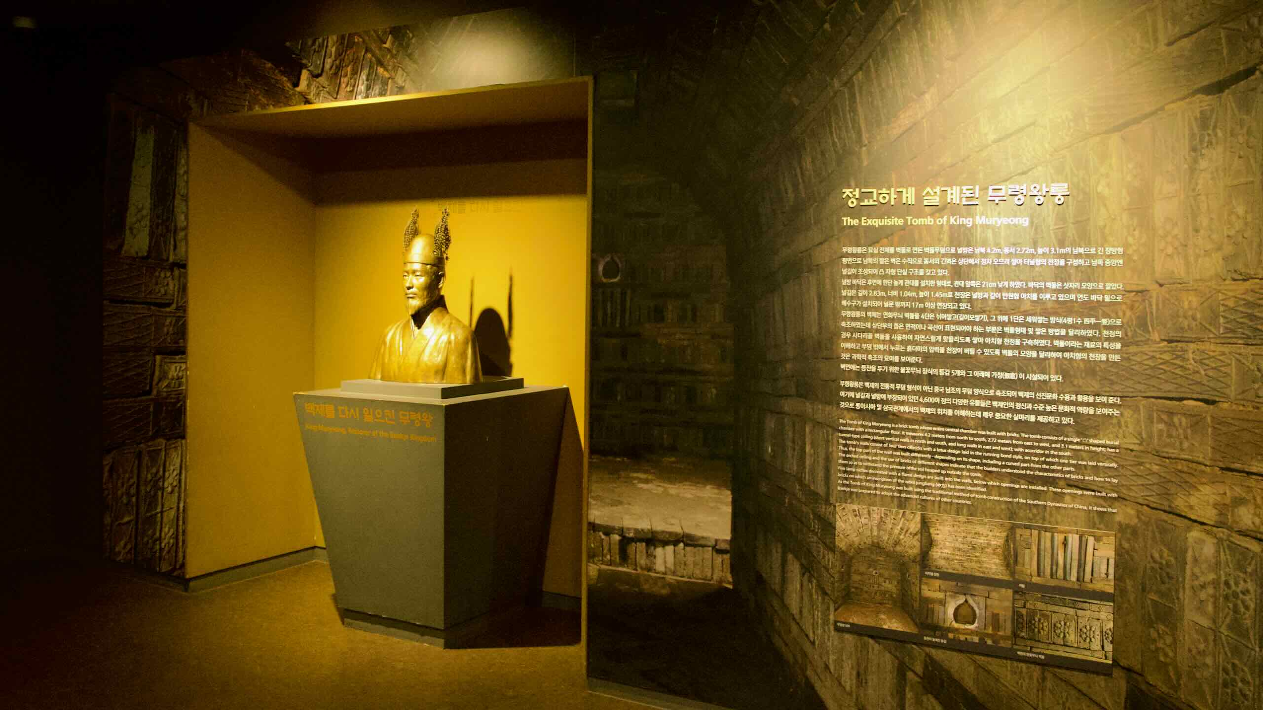 The tomb follows a Chinese-inspired brick chamber design, contrasting with the stone-lined tombs typical of Baekje. Measuring 4.2 meters in length and 2.7 meters in width, the tomb features an arched ceiling and intricate lotus-patterned bricks. These design elements reflect Baekje’s adoption and adaptation of influences from the Liang dynasty.