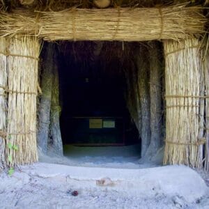 The ancient pits where thatched huts once stood now sit inside a museum, along with tools and pottery found on the site.